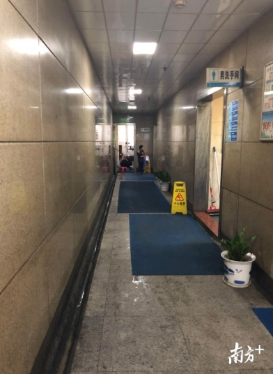 沿着一条又湿又黏的蓝色塑料地垫走进女公厕,记者看到,尽管开了抽风机,但地面上依旧有多处污水,设施老旧,洗手台上污渍斑斑,有些厕门的把手还坏了。