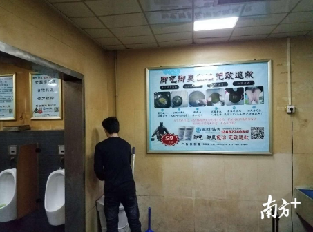 地铁1号线华强站男厕内挂满了治脚气的广告。