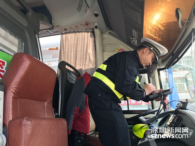现场,辅警对过往大巴司机的驾驶执照进行登记检查。