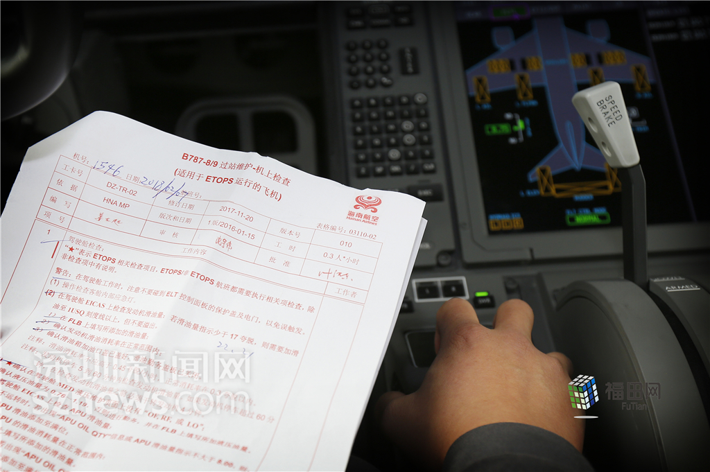朱金辉在驾驶舱按照表单做一项、签一项。