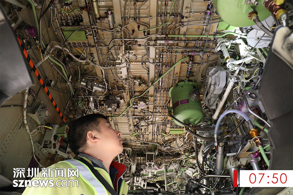 7点50分,在密如蛛网的飞机内部,张亮认真的检查每一条线路