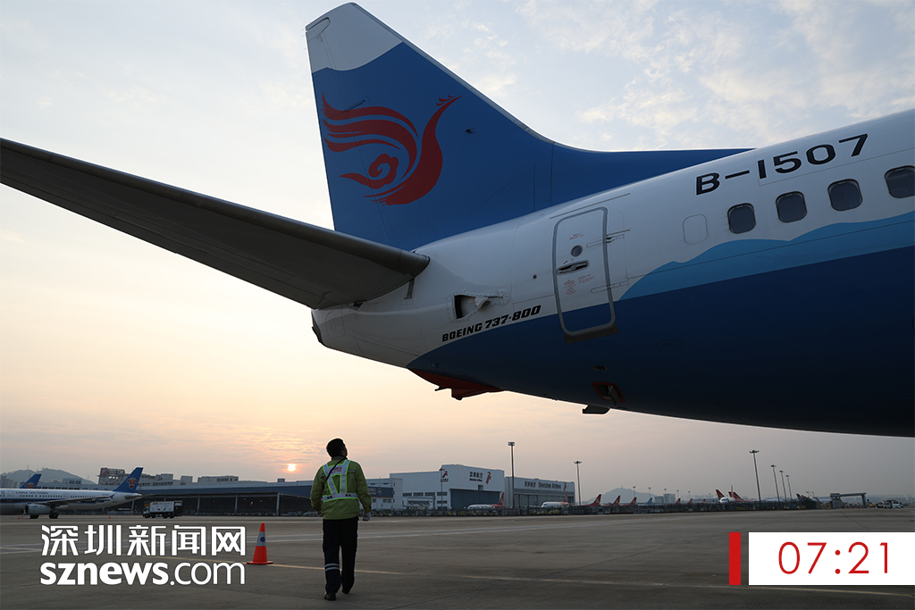7点21分,远处是冉冉升起的朝阳,近处是展翅欲飞的机翼,再加上张亮的身影,构成了机场早晨最生动的画