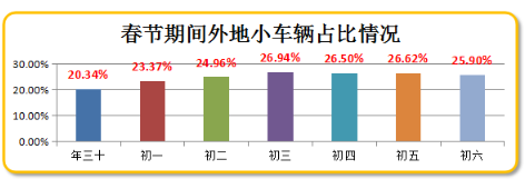 大年三十以来,我市路网平均每天行驶小汽车54.16万辆,其中外地小汽车为13.55万辆,占比为24.95%,相当于四分之一,每天的占比情况如下: