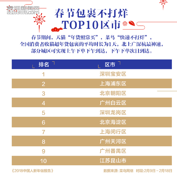 来自《2018中国人新年俗报告》的数据显示,今年春节期间,全国区县网购年货包裹量的前十名为:深圳宝安、上海浦东、北京朝阳、广州白云、深圳龙岗、北京海淀、 上海闵行、广州天河、广州番禺、江苏昆山,都是人口稠密的经济强区(县)。其中,前五名深圳就占据了2位,宝安区更是名列榜首,可见深圳人对春节网购年货情有独钟,也从侧面体现了深圳人的年货习俗已经因为互联网、电商和物流产生了变化。