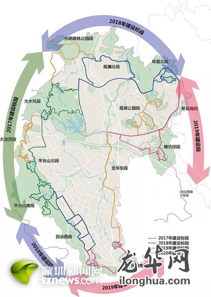 据悉,龙华环城绿道全长135公里,全线将经过7个森林郊野公园、40个城市公园、14座水库。除了主线呈一个大的环线,支线绿道也将在生态资源密集的片区形成小的环线,把龙华环城绿道打造成“大环套小环”的绿道格局。其中新建绿道96公里,提升已有绿道39公里。绿道的主要建设内容包括绿道修建、沿线区域场地处理、植物林相改造、景观节点打造、标识系统完善、电力工程及给排水相关市政设施等。龙华环城绿道将于2020年全线贯通,将生态景观资源与城市功能联系起来,成为龙华区的生态之环、文化之环,也是活力之环,发展之环。