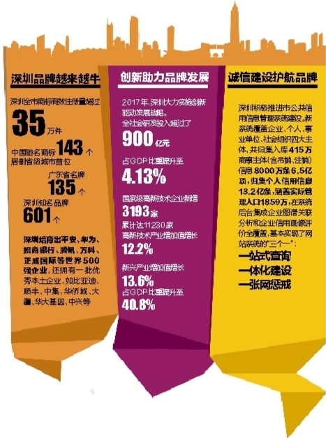 另外,深圳还积极推进市公共信用信息管理系统建设,新版系统在原深圳信用网的基础上进行了改造升级。新系统覆盖企业、个人、事业单位、社会组织四大主体,共归集入库415万商事主体(含吊销、注销)信息8000万条6.5亿项,基本实现了网站系统的“三个一”:一站式查询、一体化建设、一张网惩戒。在此基础上,深圳将深入推进信用监管改革,开展“诚信深圳”行动,对商事主体信用信息实施大归集、大应用、大防控、大监管、大奖惩,推动在产业资金、政府采购等领域应用信用信息,扩大失信商事主体联合惩戒范围,确保“双随机”抽查比例不低于5%,抽查结果公示率达100%;在信用网开设了深圳标准专栏,公示企业标准,公布质量信用承诺,建立起诚信典型“红名单”和严重失信主体“黑名单”。诚信建设为深圳品牌保驾护航,必将会产生更多更具时代引领性的深圳品牌,共同擦亮深圳这块城市品牌。