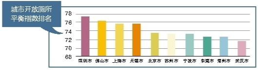 报告显示,“城市开放厕所平衡指数”排名前十位的城市分别是:深圳、佛山、上海、无锡、北京、苏州、宁波、东莞、常州和武汉。而从榜单来看,城市排名与经济发达程度有一定相关性,厕所平衡指数排名靠前的城市,均来自经济较发达的地区,大部分集中在长三角和珠三角地区。同时,重点旅游城市的排名比较靠前,旅游产业的发展对于厕所供需平衡指数的提升有积极作用。