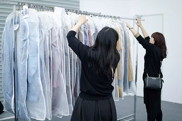 衣架上整齐有序地挂着即将用于走秀展示的服装