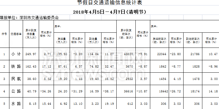 深圳新闻网4月8日讯(记者 涂胜)记者从深圳市交通运输委员会获悉,今年清明节日期间(4月5日—7日共3天),深圳陆海空铁四种交通运输工具到发旅客量为249.97万人次,同比增长2.71%。