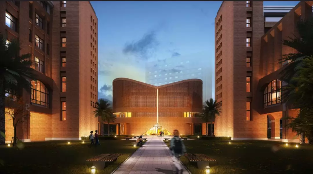 布置在教学区的北侧与东侧,在扣除河道范围及地铁控制范围之后剩余的有限空间内,以最集约的方式布置4栋高层宿舍楼。