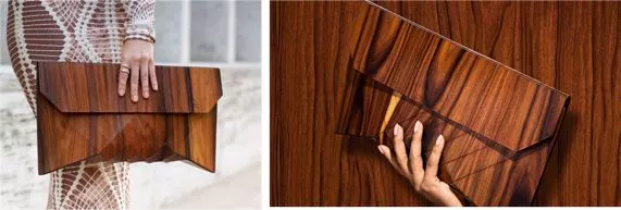由以色列“特斯勒+曼达勒维奇”(Tesler+Mendelovitch)设计工作室推出的“可穿戴木头”系列,用木头做出了时尚优雅的手包,设计完全颠覆了人们对木头的传统印象,用设计与美学的手段让木头也能成为一种时尚元素。