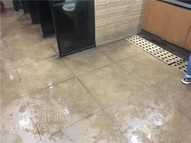 华强电子世界小便池周围地面一滩污水横流,市民进入厕所时不得不踮起脚尖以避免污水弄湿了鞋底。