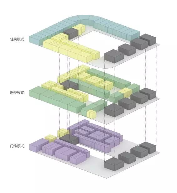 采用 “模块组合”设计方法,模块化布局保证设计的灵活性,高灵活度的设计方案可以在后期调整中轻松快捷地互换功能模块,如期推进项目建设;而在竣工后,高灵活度的建筑对医院的长期发展同样具有深远意义。