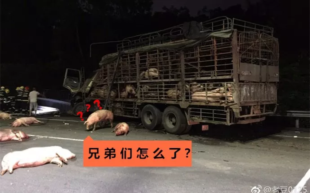 拉猪车在深圳高速上撞出护栏!上百头猪仔摔落一地
