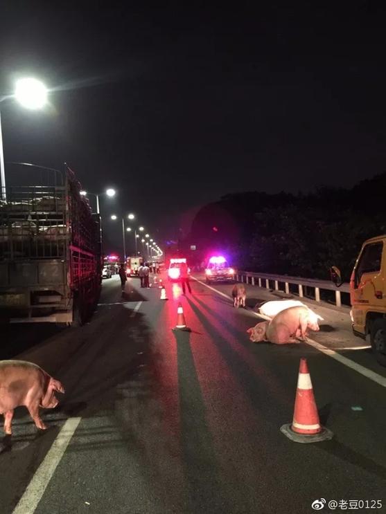 现场民警考虑到,掉落路面生猪大部分只是撞晕,若一驱赶很可能导致生猪在高速公路上乱跑乱窜至对面线引发二次事故和交通混乱。蜀黍果断选择釆取了封闭东行二条车道的管制措施,后又加紧疏通解封多一条车道,共快线和中间线两条车道可以通行。经过多方合作,紧急疏解作业,成功消除交通隐患,道路恢复通行。