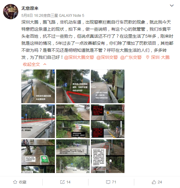 深圳新闻网5月14日讯(记者 施冰冰)5月8日凌晨零点23分,网友“无意原来”在微博写下《以后在深圳大鹏骑自行车,当心被稀里糊涂罚款》一文,并@深圳交警。该网友讲述自己在大鹏鹏飞路段机动车道内,骑自行车被罚50元的全过程。文章发布后,引起网友强烈关注,目前已有已有5万余名网友转发。