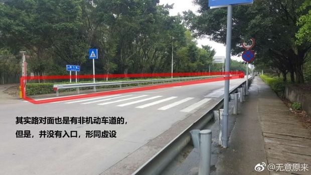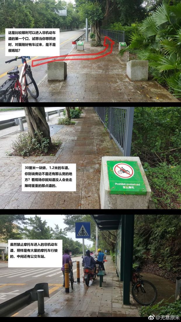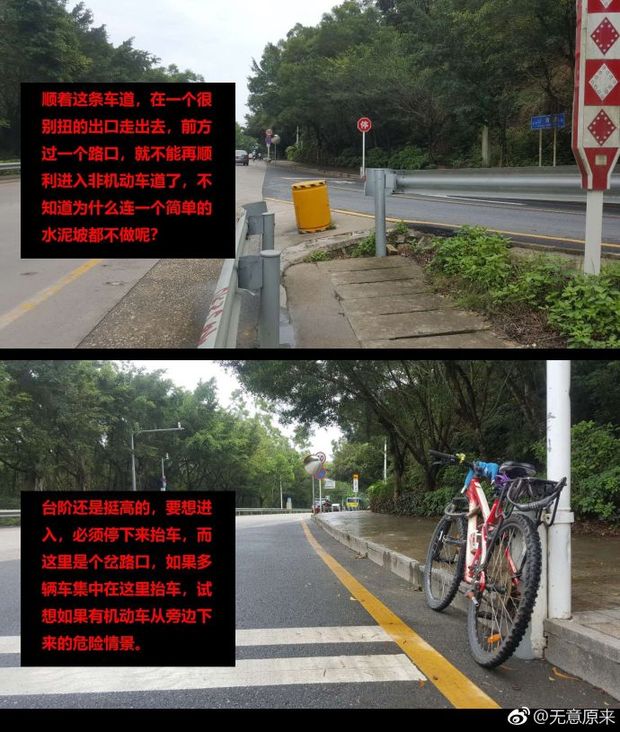 网友“无意原来”称,自己一直在非机动车道上走,走着走着,没有道了,被迫要走一段机动车道,而供人们拐非机动车道的,只有一个很小的口,台阶很高,只是简单的用水泥做了个小坡,很不容易进入,尤其是遇车时,根本就进不去。所以就走到了机动车道。