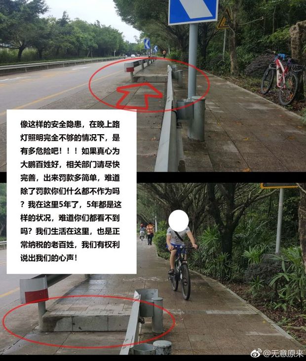 微博发出16小时后,该网友又于8日16点26分,贴出一组图片,配文质问大鹏道路规划建设,并@深圳交警相关部门。该组图片主要是鹏飞路段机动车与非机动车道的路况实景图,图片上配有箭头及相关文字说明。