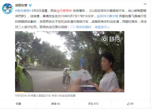 5月9日9点39分,深圳交警官方微博发出一则情况通报,就网友@无意原来《以后在深圳大鹏骑自行车,当心被稀里糊涂罚款》一文进行回应,并附上当时执法视频。