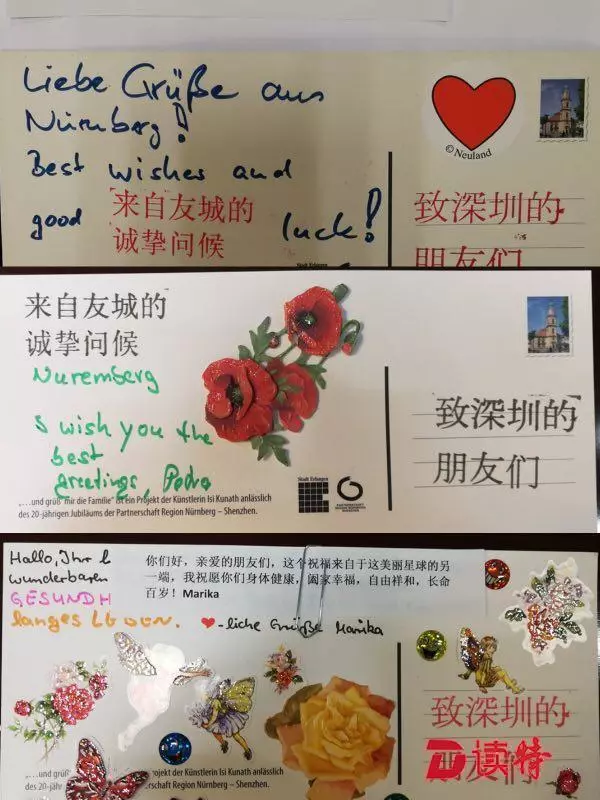 2017年5月27日,深圳市外办欧非处负责人收到了“老蜜”纽伦堡为深圳准备的意外“大礼”,纽伦堡地区市民的祝福与心愿通过近百张明信片“飞”到了深圳。“你好,亲爱的朋友们,这个祝福来自于这美丽星球的另一端”、“期盼未来两市间合作共赢,继续开发新项目并持续发展伙伴关系”……爱尔兰根市长和200多位市民亲笔书写的明信片从欧洲一路传递着“鹏友”的温度到达了深圳。
