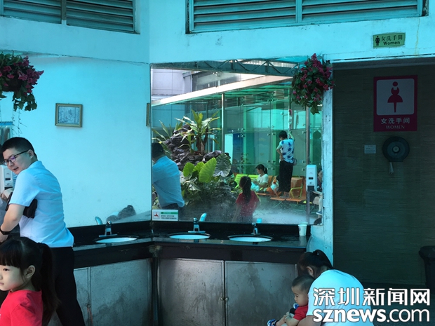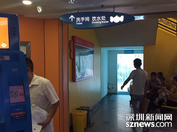 一楼大厅正式的洗手间位于两栋楼之间的天井,标识一眼可见。其中女厕的厕纸统一在入门处自取,厕位内无纸巾,也无置物台。女厕墙上设有一个可收起放下的换尿布台,尿布台旁有两个儿童小便池,可方便妈妈们把男宝宝带到此处小便,无需分开。女厕每个厕位有垃圾桶,门后及两侧墙各有挂钩一个,加起来挂钩共三个,美中不足的是厕所内无置物台,厕位内的墙上有各种乱写乱画的小广告影响观感。