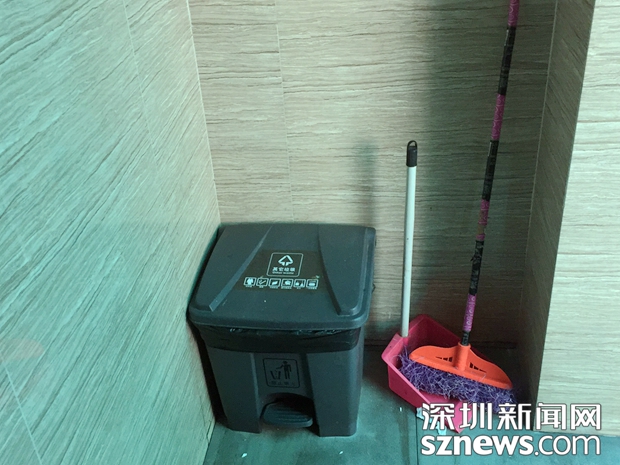 一楼女厕入门处的带盖垃圾桶和清洁工具