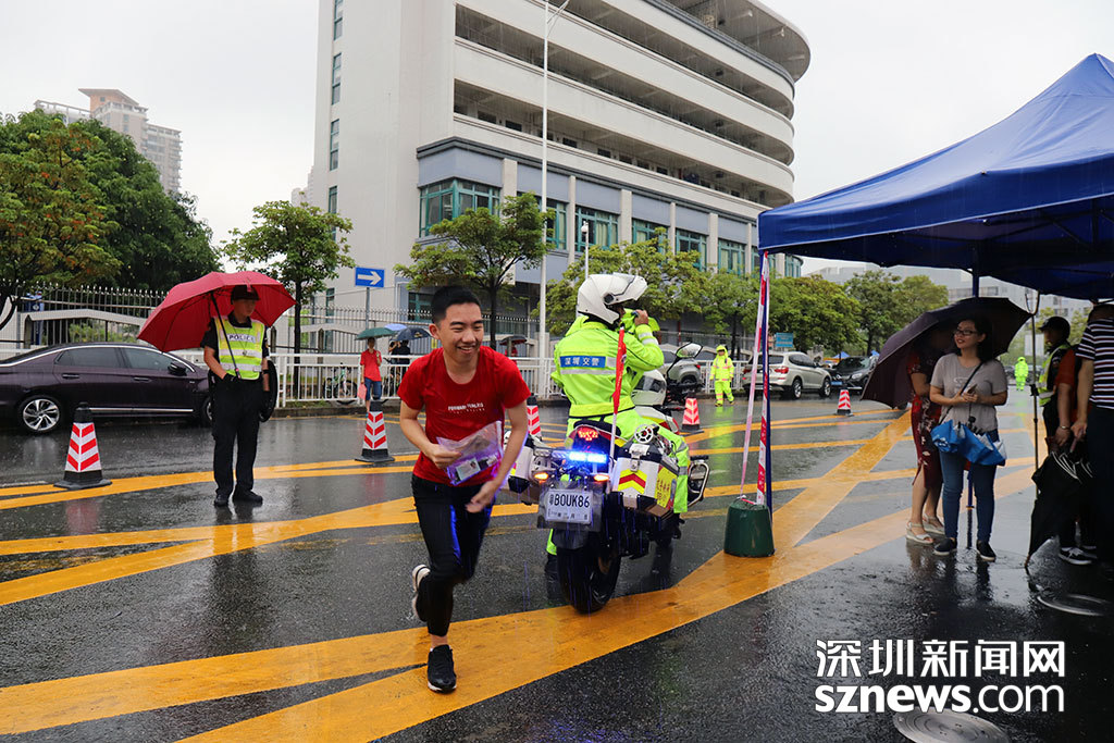 宝安中学考点,交警护送一名考生赶到考场,考生下车向考点奔去