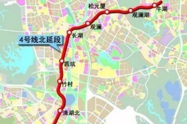 4号线北延段是深圳市重要民生工程之一,工程均在龙华新区范围内,线路总体呈南北向,由现运营的4号线终点清湖站北端引出,由南至北依次沿和平路、观澜大道、高尔夫大道敷设,沿途设有清湖北站、竹村站、茜坑站、长湖站、观澜站、松元厦站、观澜湖站、牛湖站共8个车站,其中清湖北站为高架站,而观澜站则规划与龙华现代有轨电车换乘。
