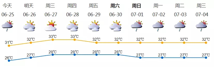我市多云,有阵雨;气温26-31℃;西南风2-3级;相对湿度70%-95%。