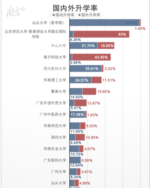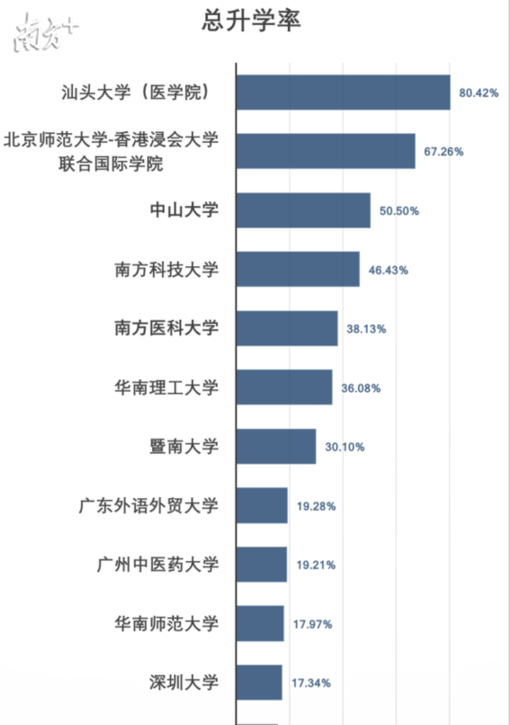 在总升学率中,排名前10的是汕头大学(医学院)、UIC、中山大学、南方科技大学、南方医科大学、华南理工大学、暨南大学、广东外语外贸大学、广州中医药大学和华南师范大学。