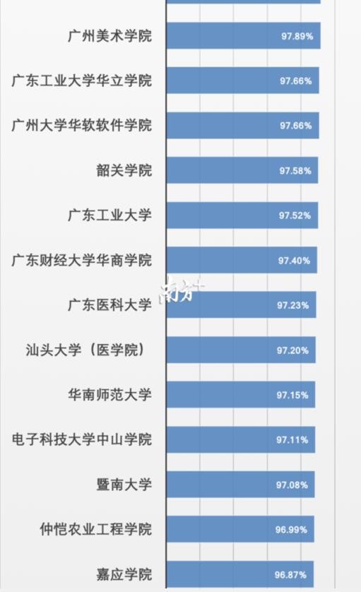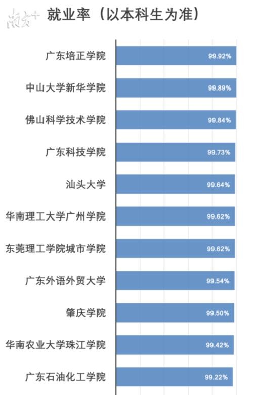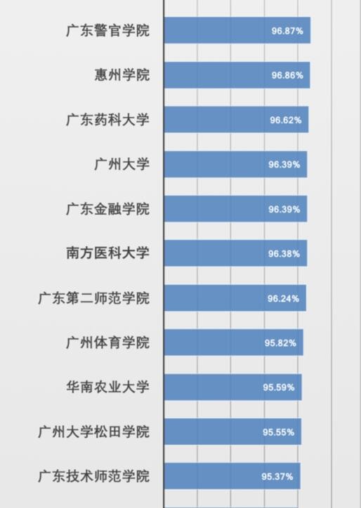 和往年一样,就业率广东各高校都处于高位,绝大部分学生都能就业,其中广东培正学院、中山大学新华学院、佛山科学技术学院、广东科技学院、汕头大学、华南理工大学广州学院、东莞理工学院城市学院、广东外语外贸大学和肇庆学院,就业率都在99.5%以上。