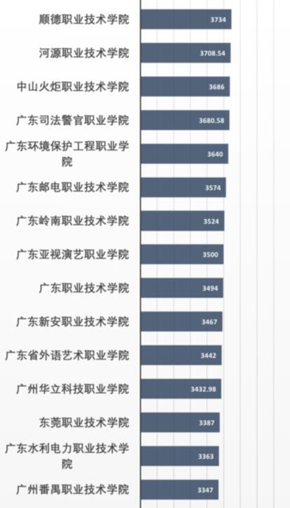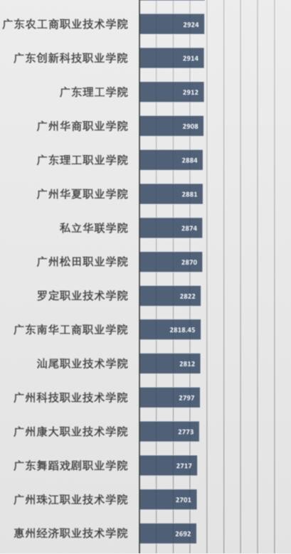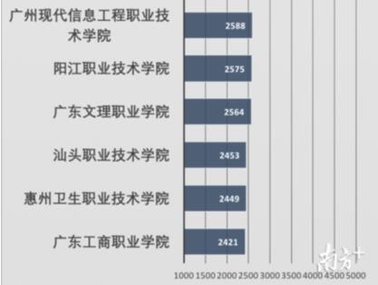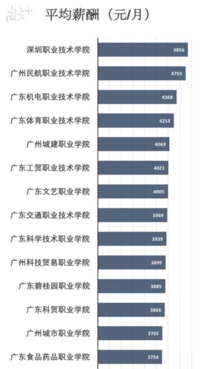 在专科薪酬榜中,毕业生平均薪酬超过4000元的有7所,他们是深圳职业技术学院、广州民航职业技术学院、广东机电职业技术学院、广东体育职业技术学院、广州城建职业学院、广东工贸职业技术学院和广东文艺职业学院。