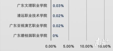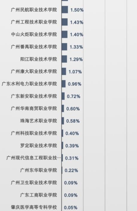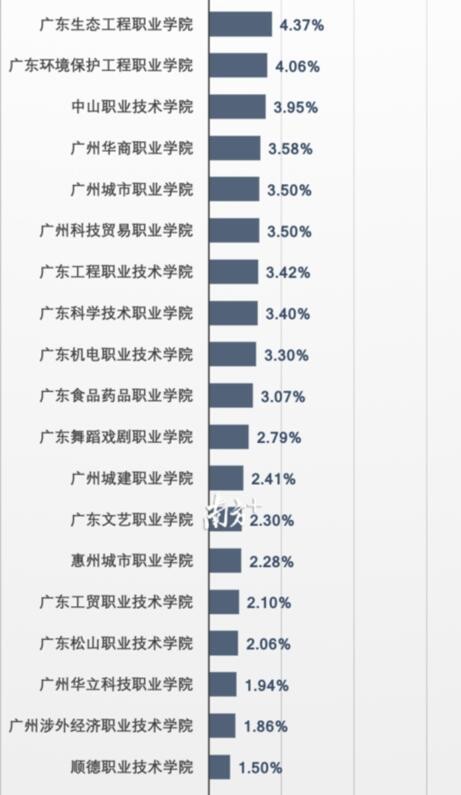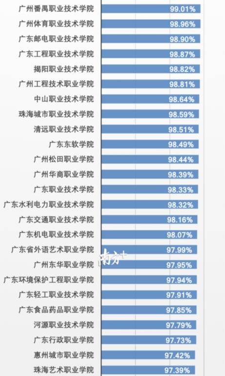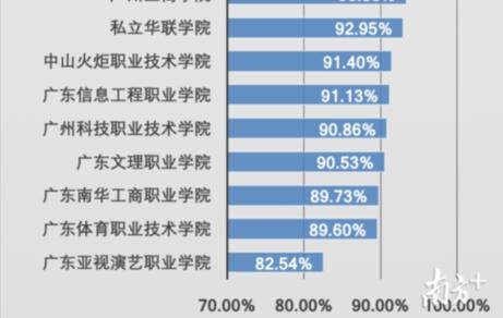 专科就业率榜单中,2所学校就业率100%,他们是广东碧桂园职业学院和江门职业技术学院,21所学校就业率在99%以上。已公布的数据中,只有3所就业率低于90%,分别是广东南华工商职业学院、广东体育职业技术学院、广东亚视演艺职业学院。