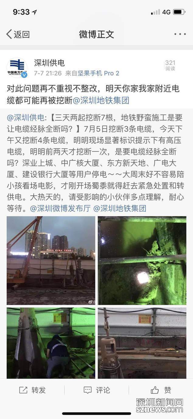 “对此问题再不重视不整改,明天你家我家附近电缆都可能再被挖断”深圳供电局微博吐槽@深圳地铁集团。截止到22:00,@深圳地铁集团未在微博回应。