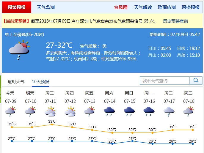 深圳新闻网7月09日讯(记者 何畅)深圳市气象台预计,9-10日多云有雷阵雨,部分时间雨势较大,27-32℃,湿度65%-95%;11-12日天气酷热,能见度下降,有灰霾,可能出现局部强对流天气;13-15日有一次较明显的降水过程。