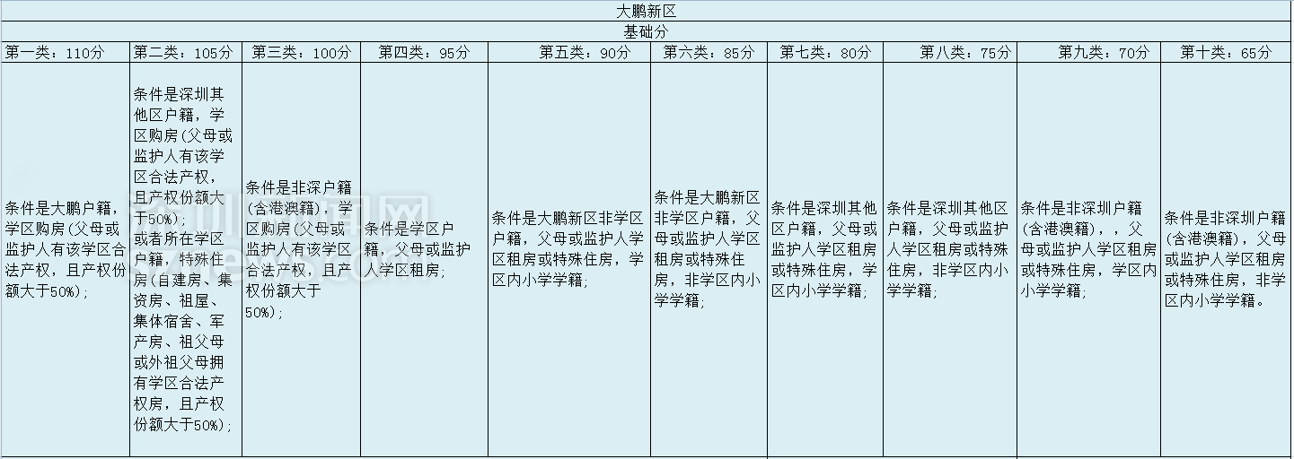 大鹏新区共分为三个学区,即:葵涌学区、大鹏学区、南澳学区,都已实行按学区积分高低进行学位排队的制度。