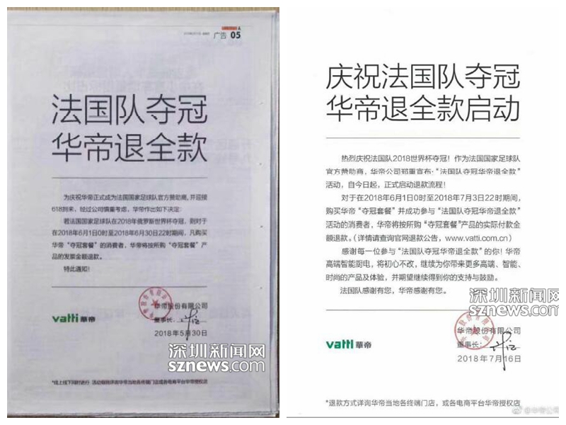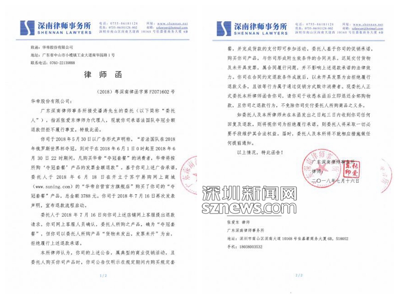 深圳新闻网7月18日讯(记者 张玲)2018世界杯落幕,法国队拿下“大力神”杯,国内蹭世界杯热度做营销的最大赢家应该是华帝无疑了。华帝股份有限公司在今年世界杯期间推出“夺冠套餐”,承诺法国队夺冠华帝退款。赛事结果出来后,球迷惊呼华帝这一波营销操作实在是666……但是,我们只猜中了开头,却没猜中结尾——深圳消费者潘先生买了“夺冠套餐”却遇到退款不成的情况。这次,潘先生较真了,委托深南律师事务所律师张爱东于7月16日给华帝公司发出了律师函。