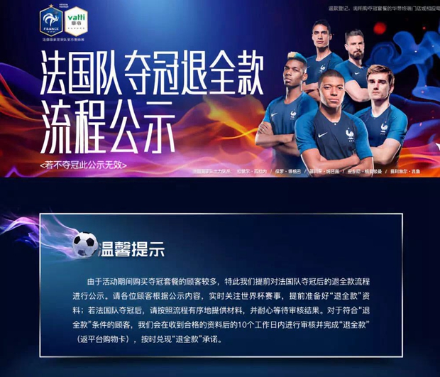 律师函提到,华帝股份有限公司于2018年5月30日以广告形式声明称,“若法国队在2018年俄罗斯世界杯夺冠,则对于在2018年6月1日0时起至2018年6月30日22时期间,凡购买华帝‘夺冠套餐’的消费者,华帝将按所购‘夺冠套餐’产品的发票金额退款”。