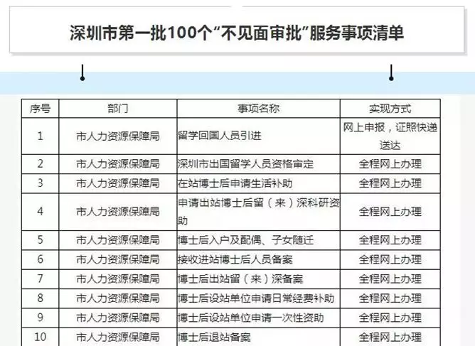 深圳第一批100个“不见面审批”服务事项部分清单