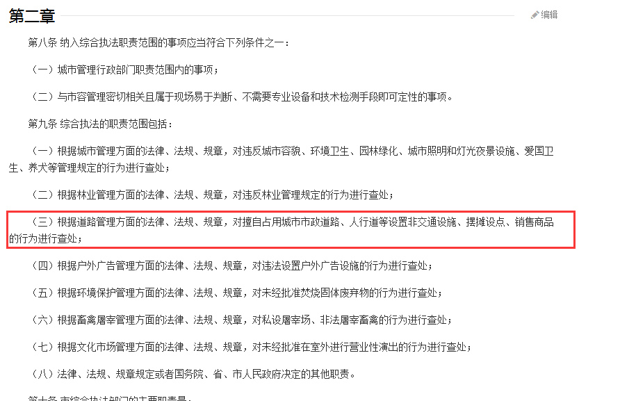 记者查询了《深圳经济特区城市管理综合执法条例》后发现,深圳市城管局综合执法的职责范围包括了对擅自占用人行道等的违法行为进行查处。