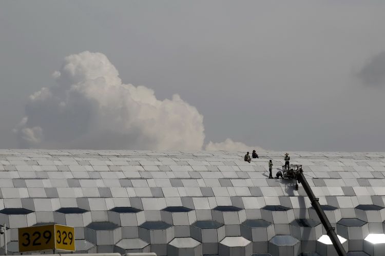 ◥ 工人们在机场顶部换灯。太阳直射,外墙顶部亮得刺眼,人被热烘烘的空气烤着,酷热难耐。