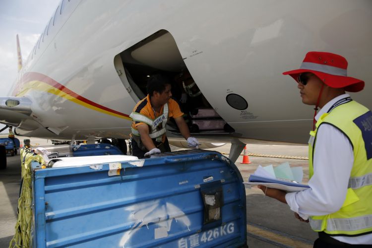 ◥ 汗流浃背的工作人员为飞机运输空调冷气。