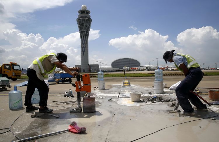 ◥ 工人们在停机坪上挥汗如雨地施工。