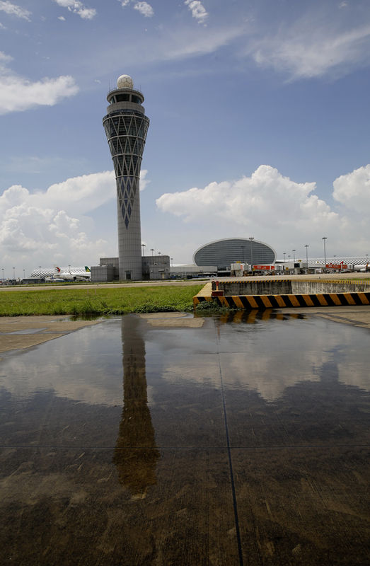 ◥ 蓝天白天和机场塔倒映在水中。暴晒后的机坪地表温度接近60-70℃。