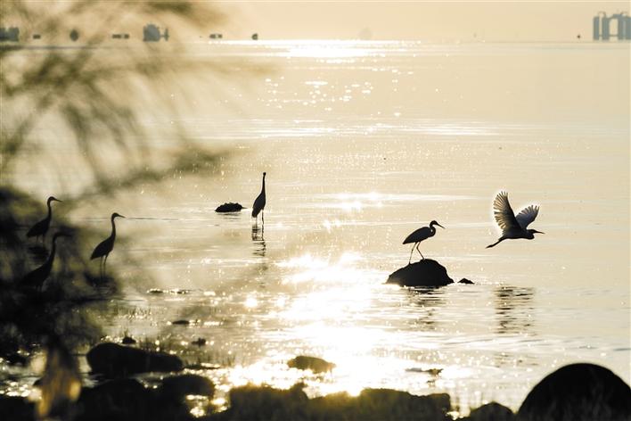 喷薄的红日刚跳出海平面,白鹭便开始在沙洲附近忙碌起来。