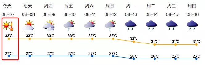 我市多云间晴天,局部有阵雨或雷阵雨,天气炎热到酷热;气温27-33℃,中北部及人口密集区35℃或以上;东风2-3级;相对湿度55%-90%。