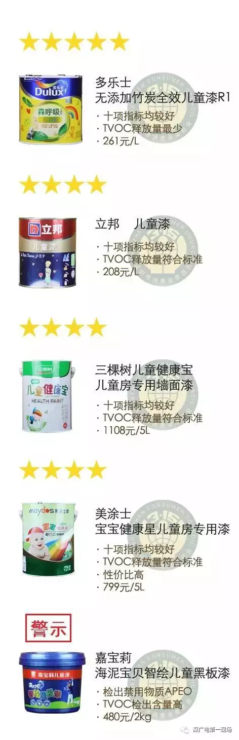 3、5款儿童漆评出:5星产品1款,4星产品3款↓↓↓