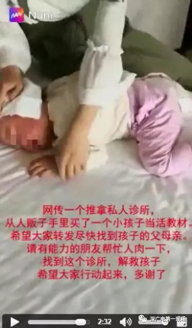 视频中出现的人,除“推拿”男子以外其他人都是穿着不同的便装,不像是视频中字幕所描述的拿小孩当教材的私人诊所学生,男子在“推拿”过程中也没有太多讲解,只是在解释孩子只是害怕不会痛的。