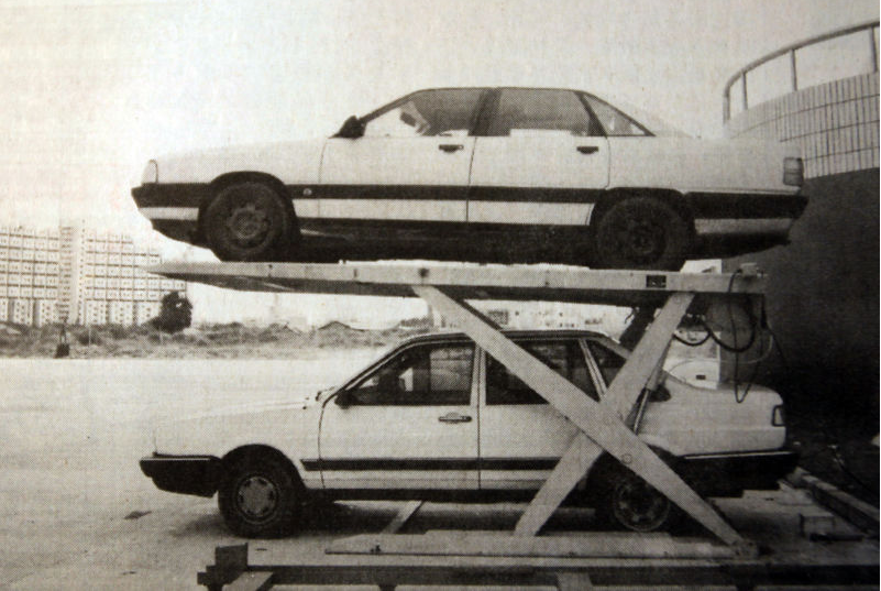 1994年,一种适用于单位停车场、公用停车场和家庭自用的双层停车架在深圳体育馆门前的展示会上展出。