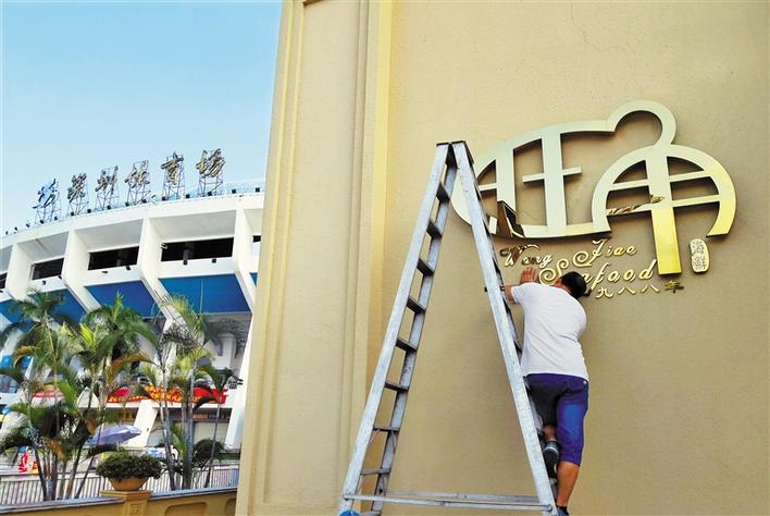 昨日清晨,深圳体育馆旁的旺角餐厅员工开始进行拆除作业。
